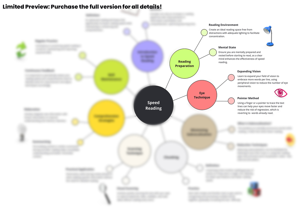 Master the art of speed reading with our expertly designed Concept Map. This visual guide breaks down the complexities of reading efficiently into a structured, easy-to-understand format, ideal for anyone eager to enhance their reading skills and learning capacity.